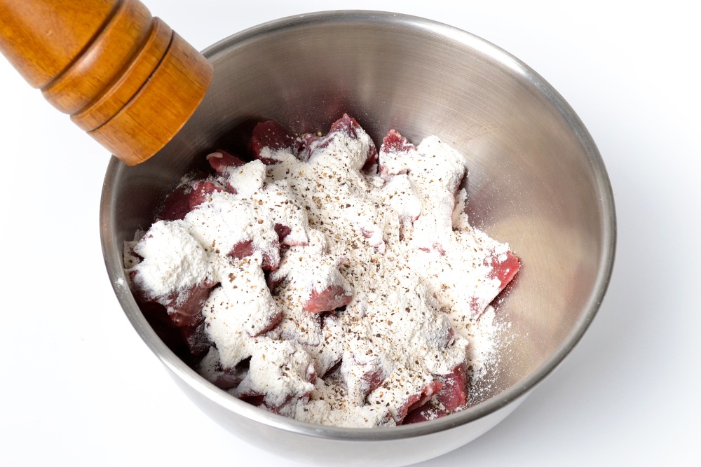 Place the meat in a bowl, sprinkle with flour and black pepper, mix thoroughly.