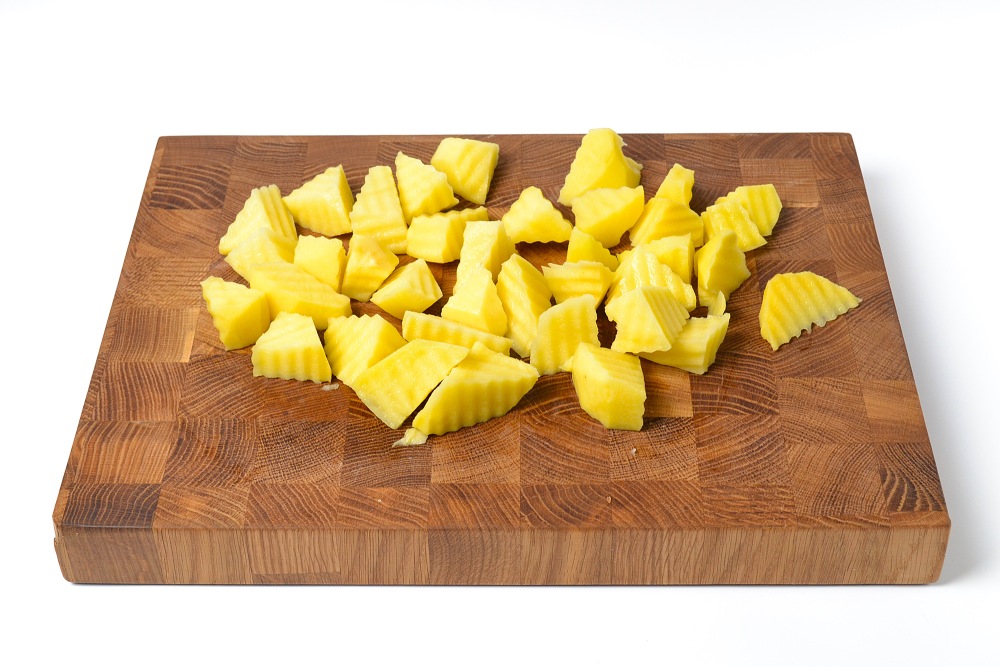 Coarsely chop the potatoes. The pieces may be slightly larger than carrots. During simmering, even large pieces will have time to cook.