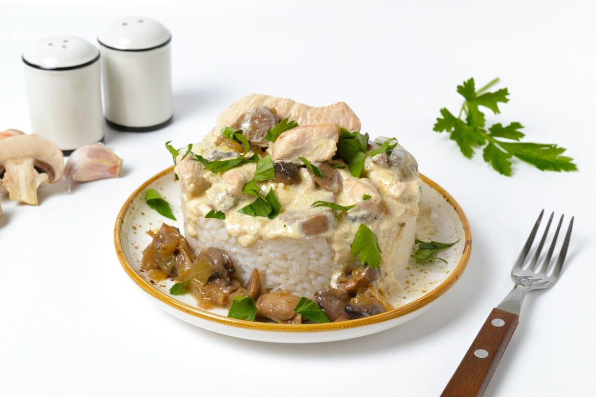 Serve a turkey in sour cream sauce with mushrooms with your favorite side dish, decorating with greens. In my case, a steamed long -grain rice prepared in a double boiler. Bon appetit!