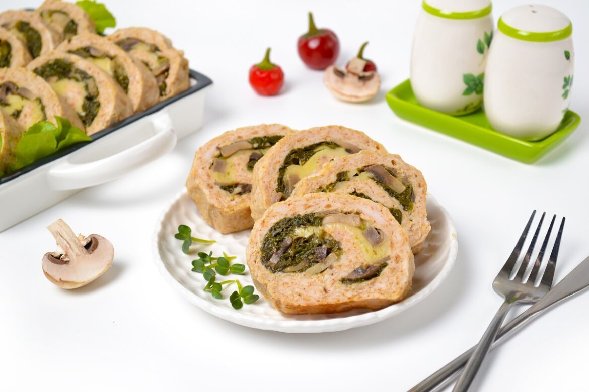 Minced chicken roll with mushrooms is ready. Cut into portions and serve on lettuce leaves or garnish with herbs if desired. Bon appetit!