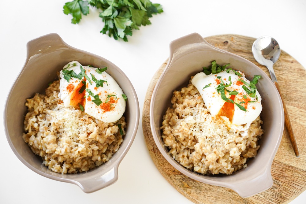 Sprinkle the dish with additional Parmesan, sprinkle a little sweet or smoked paprika, and add finely chopped fresh herbs on top. Serve the dish immediately while the oatmeal remains hot and the yolk in the poached eggs remains tender and runny.