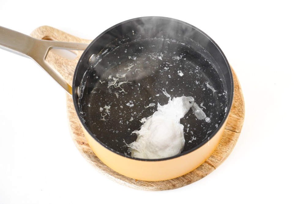 Pour water into a small ladle or small pan, the depth of the water should allow the egg to “float” and not touch the bottom. Pour in 0.5 teaspoon of vinegar and place the ladle on the stove. Turn the heat to high and bring the water to a boil.