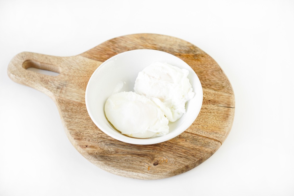 Pour water out of the ladle, pour fresh water again, add the remaining vinegar and bring to a boil. Repeat all steps with the second egg, observing the same careful movements. Cook again for 4 minutes and remove with a slotted spoon, being careful to keep the egg intact.