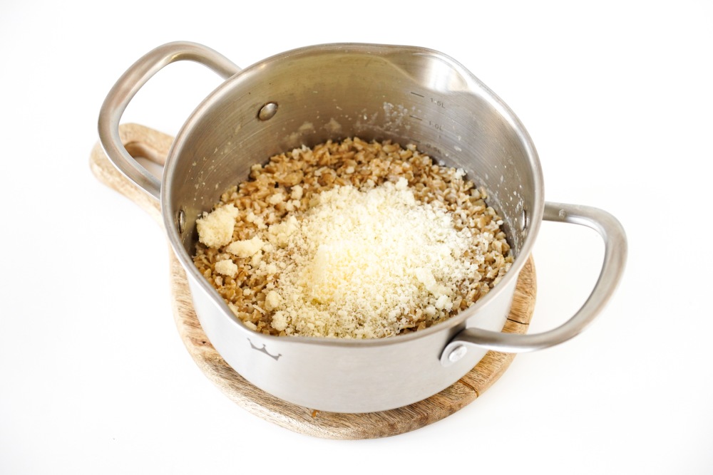 5 minutes before the oatmeal is ready, add butter and add grated Parmesan. Stir thoroughly to completely melt the cheese and create a creamier oatmeal texture.
