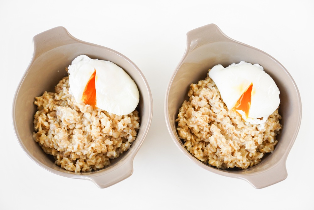 Place the poached eggs on top of the oatmeal, being careful not to damage the shell. Take a sharp knife and make a small cut along the top of the egg so that the yolk protrudes slightly, this will make the dish more appetizing and allow the yolk to spread beautifully over the oatmeal when serving.
