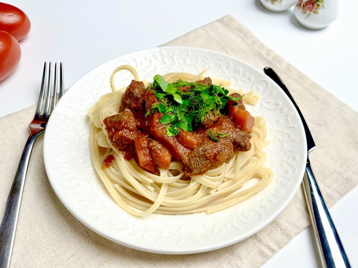 Before serving, be sure to sprinkle the pasta with beef in tomato sauce with fresh finely chopped herbs. It will add bright colors and freshness to the dish. Bon appetit!