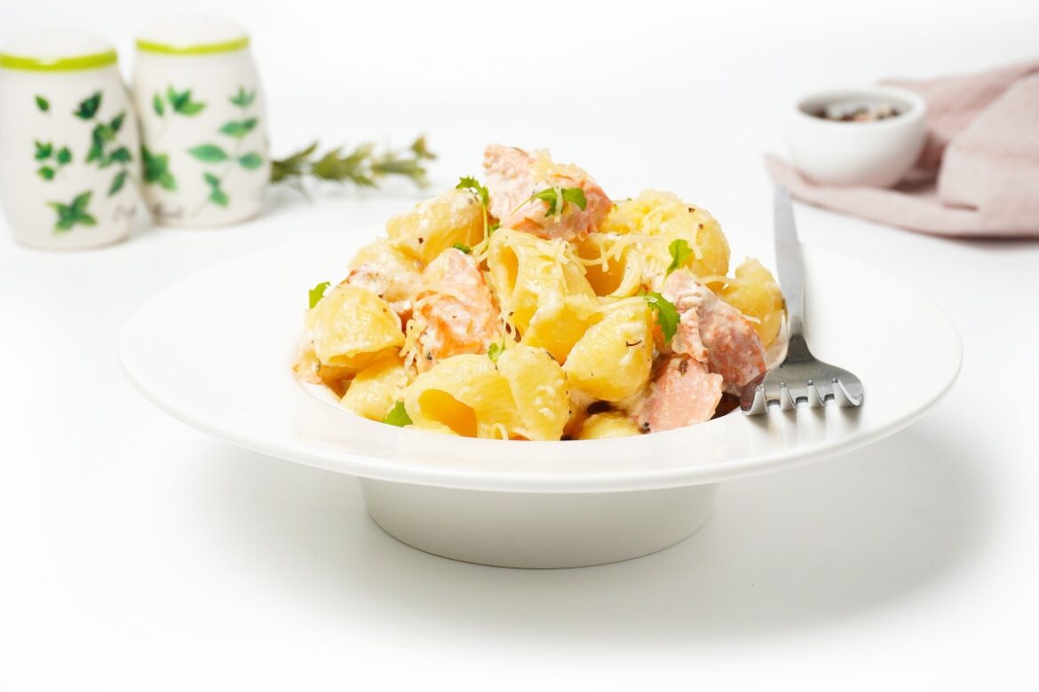 Prepare ingredients for salmon pasta in creamy sauce. For this recipe, it is better to use skinless fillet; it is the easiest to work with. But if this is not the case, it doesn’t matter: take any fillet with skin on it or even steaks. You can also use frozen fish — just take it out about a day before cooking and put it in the refrigerator to defrost. I took coho salmon, but trout, salmon, sockeye salmon, and even chum salmon are also suitable.