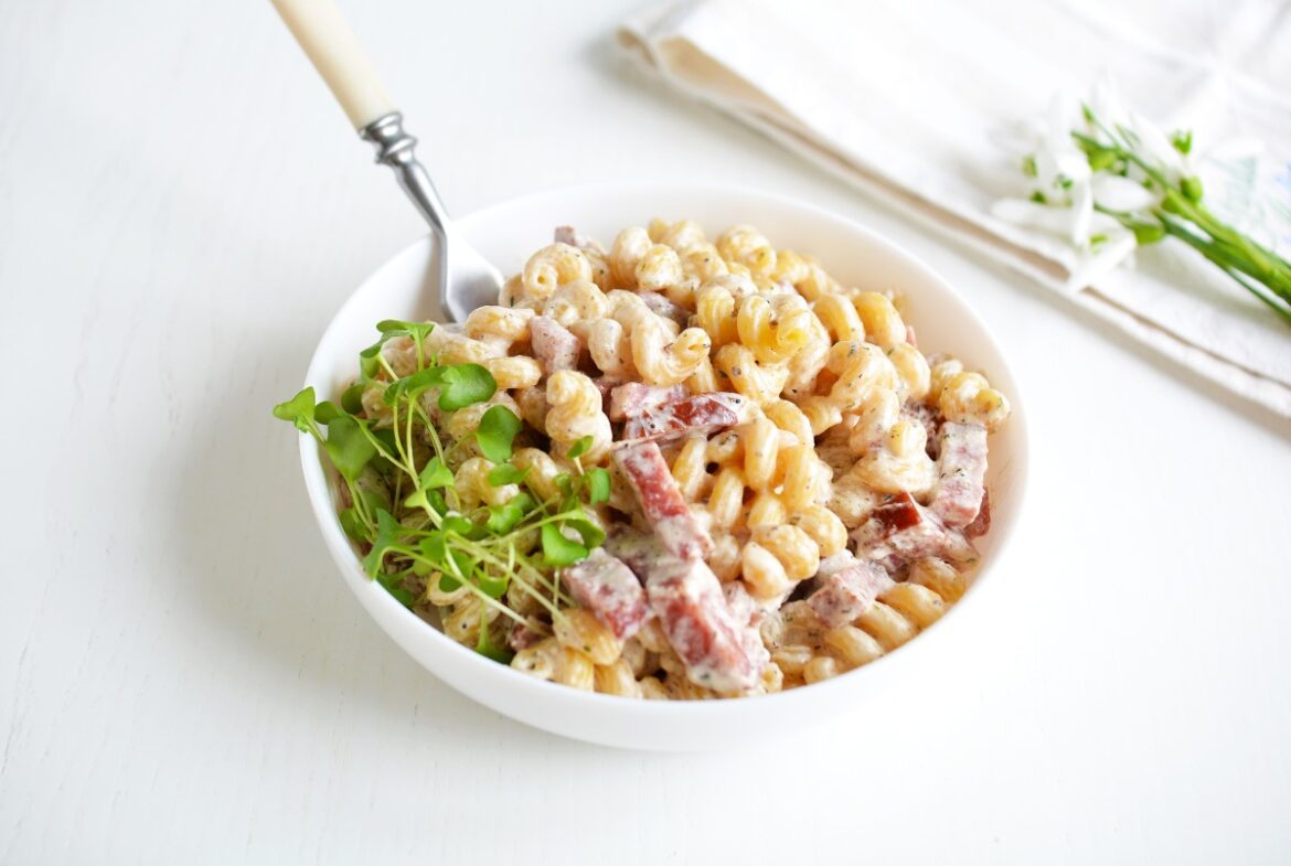 You can take any sausage that you have in stock. I like to use a slightly braided servel. The taste of ready -made pasta is very bright and saturated with it. You can take ordinary ham or even sausages.