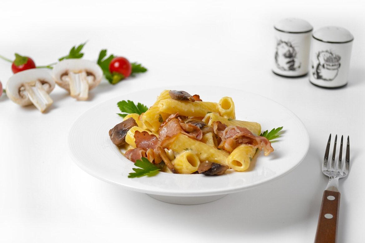 Paste with bacon and mushrooms in creamy sauce is ready. Immediately lay out on plates and serve to the table hot. You can additionally sprinkle with freshly ground pepper.