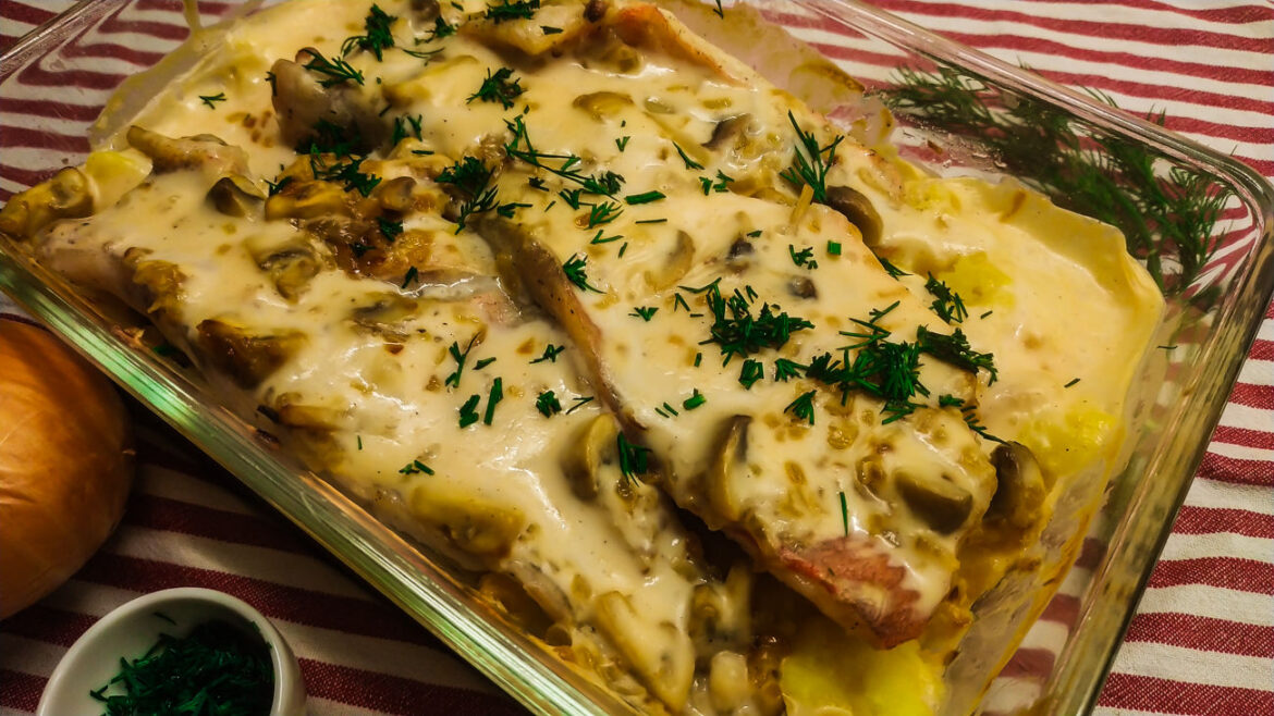 Today we have an interesting recipe for making fish in company with potatoes and mushrooms.