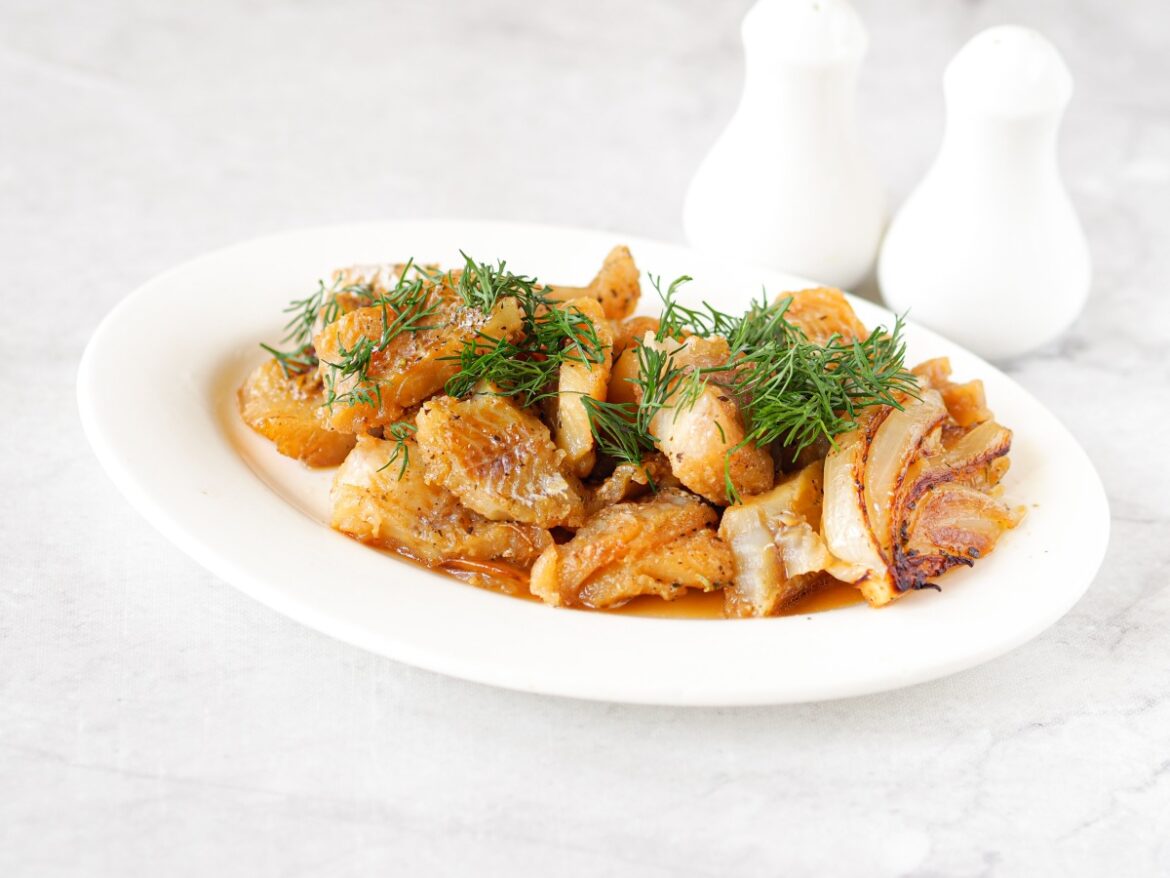 Serve a delicate milky fillet with herbs on the table. The fish prepared in creamy on theisan sauce, thanks to this it became fragrant and very tasty. Caramelized onions can be served with fish, or only fillet can. This is a matter of taste.