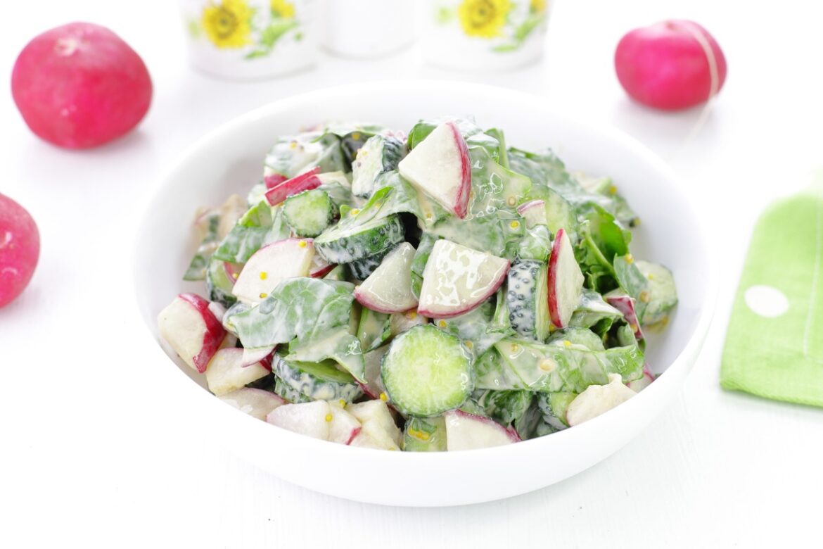 That's all — a light and refreshing salad of radishes and a cucumber with sour cream is ready. Serve right away while the vegetables retain a crunch.