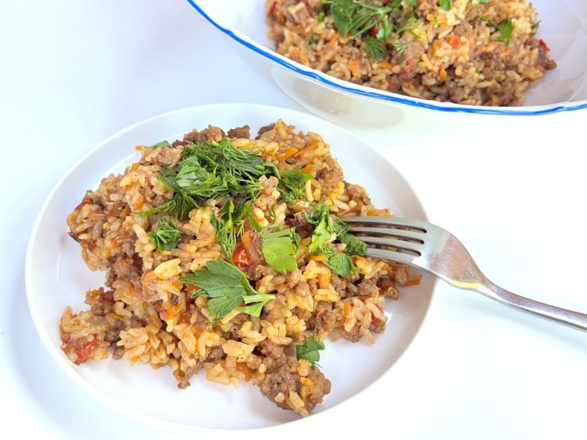 At the end of cooking, mix the rice with the minced meat and let it “rest” in the slow cooker for about 10 minutes. Sprinkle with finely chopped herbs and serve hot. As with pilaf, this dish goes well with a salad with tomato, onion and herbs. Bon appetit!