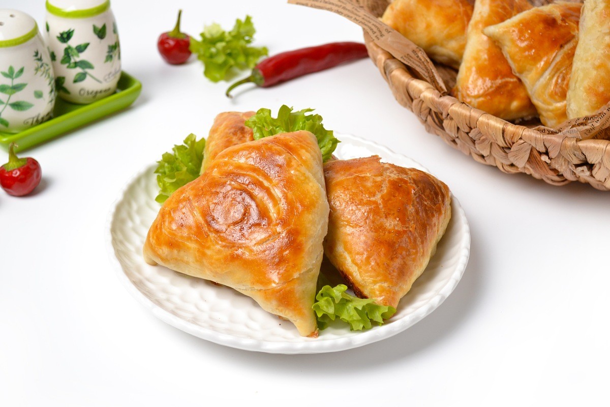 Cool the finished samsa a little by removing it from the parchment and placing it on a wooden board or wire rack. Serve hot — fresh classic samsa, prepared according to the recipe for home conditions, will be the most delicious and juicy. Bon appetit!