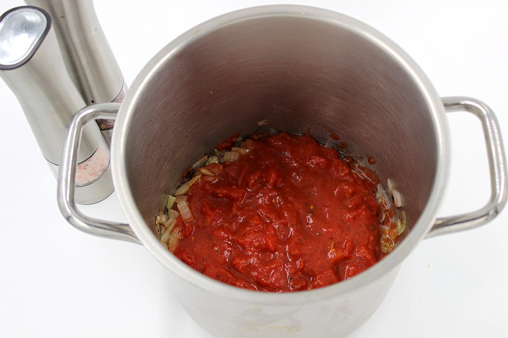 Step 4Add a can of chopped tomatoes to the onion and simmer for 5 minutes. When tomatoes are heat treated, the taste is enriched, the acidity disappears, and a slight sweetness appears.