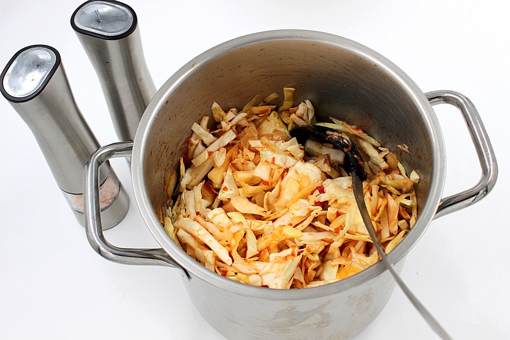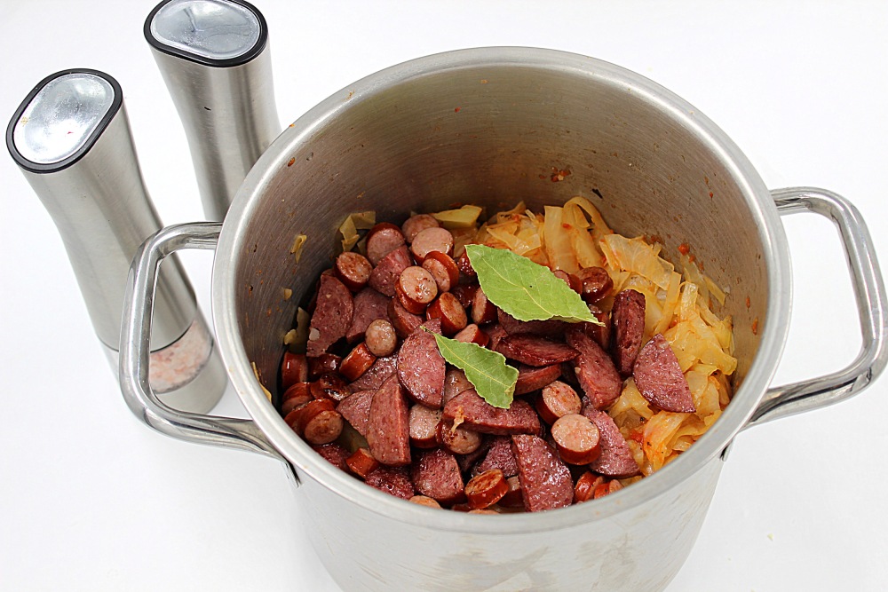 Step 9Check the cabbage for softness and if everything is good, add sausage and bay leaves. Simmer for another 15 minutes.