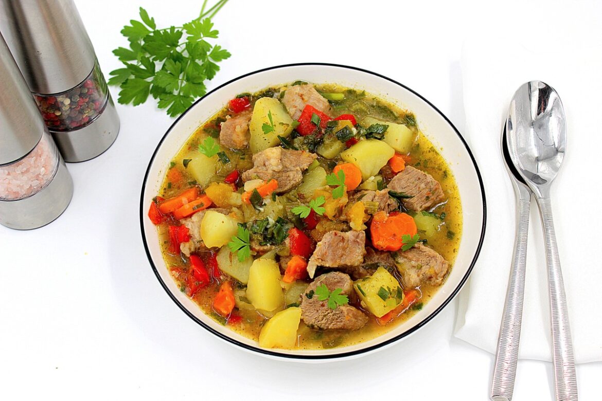 Well, while the meat is stewing, peel and chop the potatoes and bell pepper.