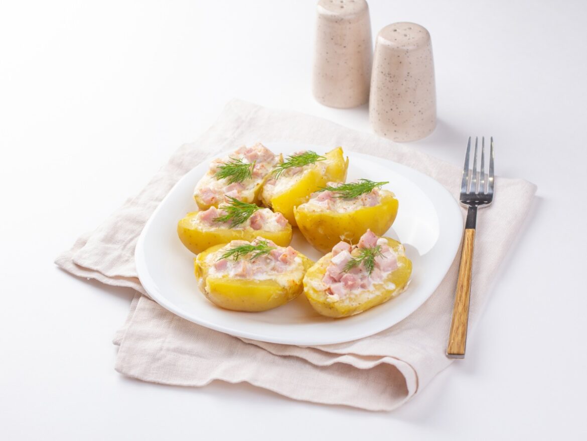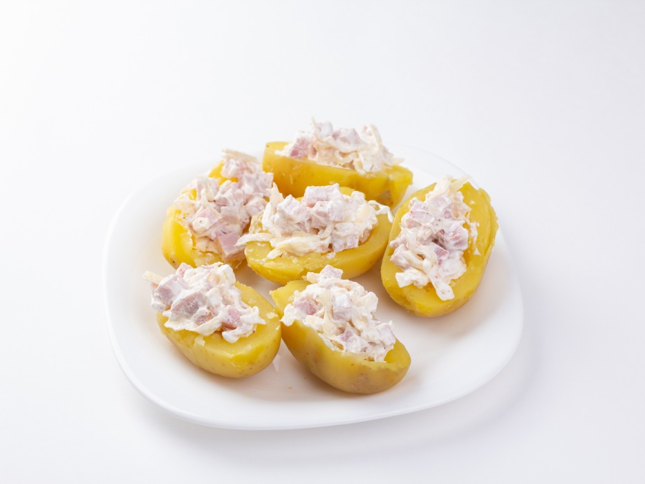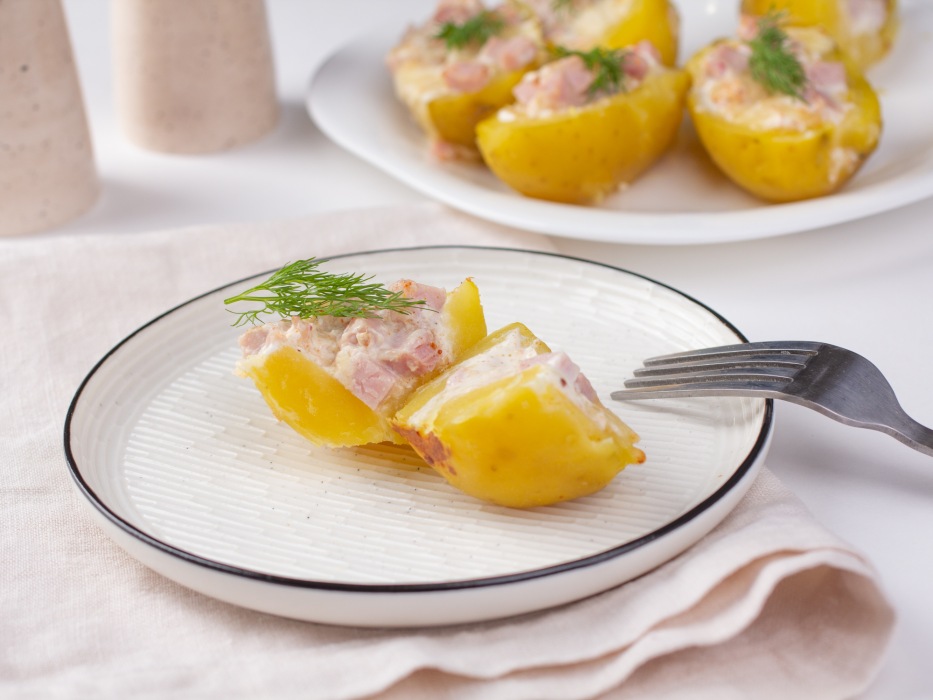 Bake the stuffed potatoes in the oven for 5-7 minutes. The cheese and ham should be slightly browned.