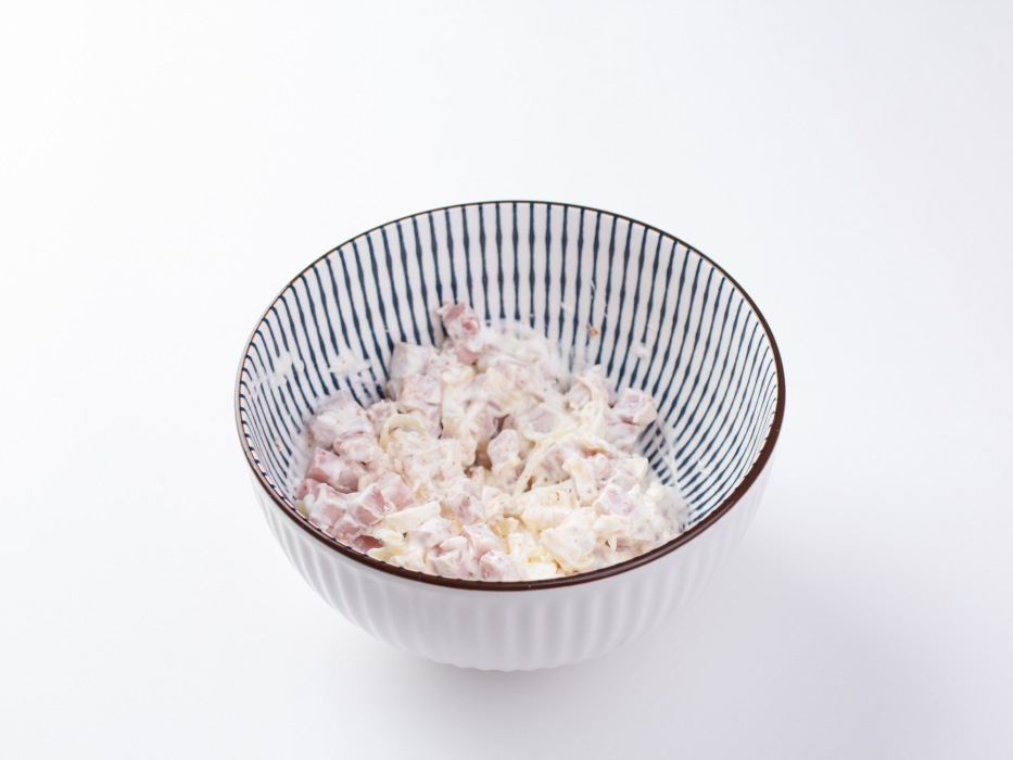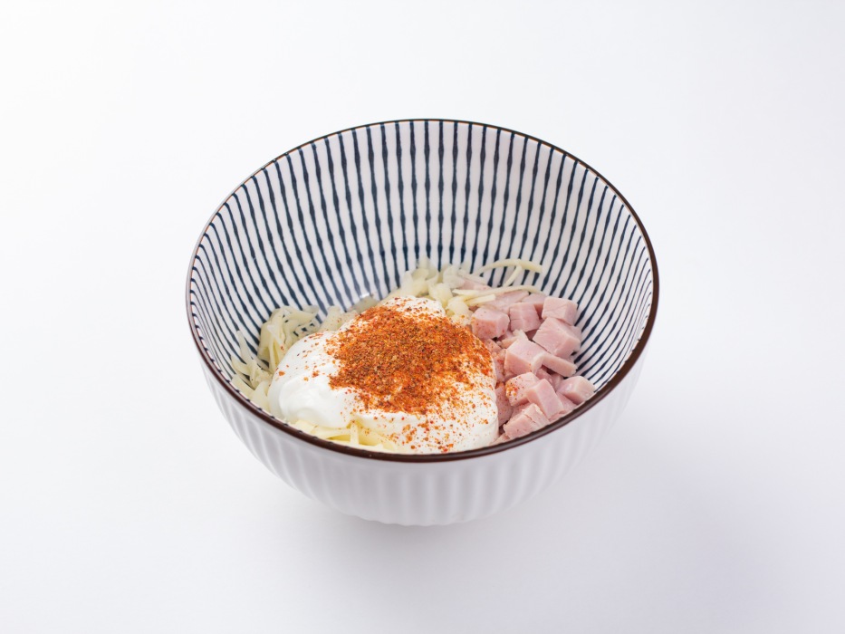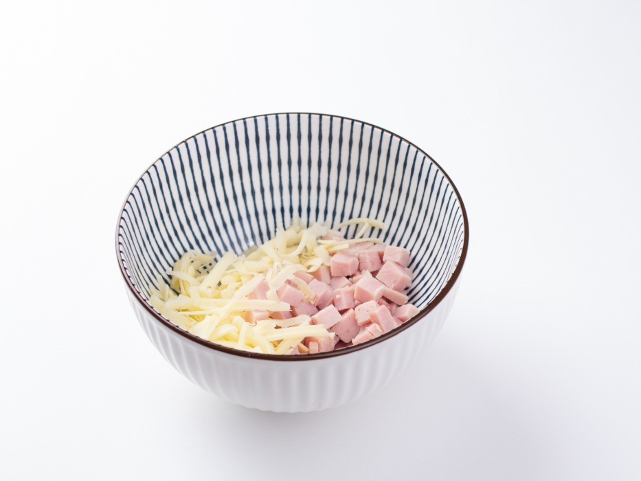 Measure out the required amount of sour cream, ham and cheese. Ham can be replaced with bacon.