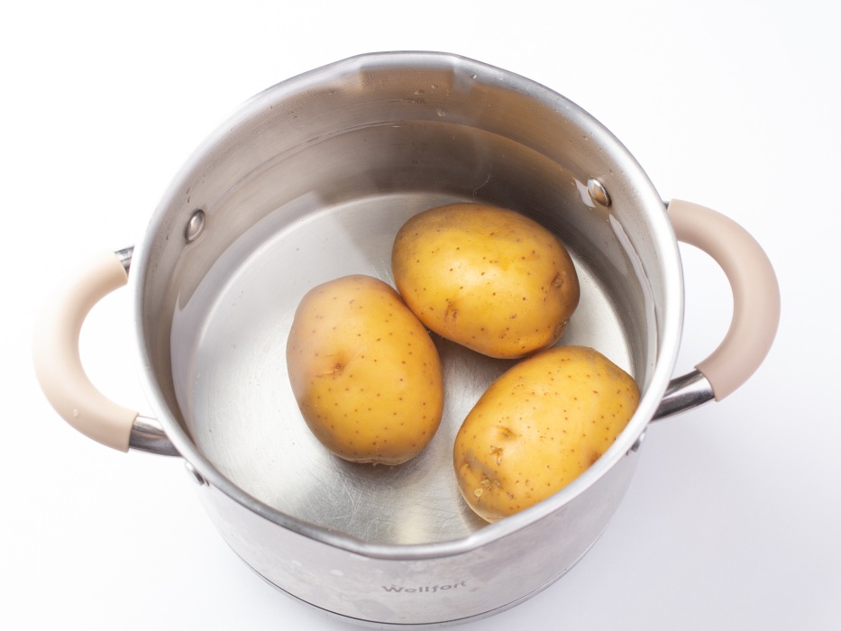 Remove the pan from the stove, drain the water and remove the potatoes. Place it on a plate and let cool.