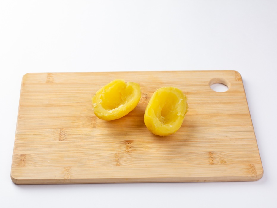 The main thing is not to rush and remove the pulp carefully, otherwise the potatoes may fall apart. Make as large a hole as possible in the potato half to accommodate as much filling as possible. This will make the potatoes much tastier.