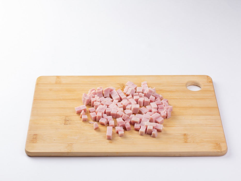 Cut the ham into cubes. If you wish, you can replace it with bacon.