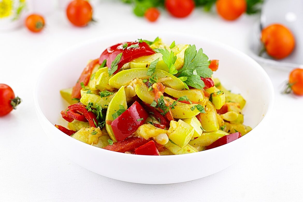 Add salt, ground black pepper, Italian herbs to taste. Mix. Stew zucchini with vegetables over low heat under the lid for 8-10 minutes.